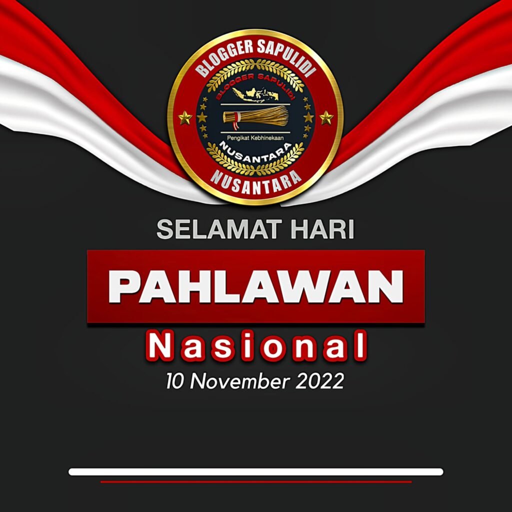 Relawan Sapulidi Nusantara yang mulai dikenal dengan Komunitas Bloggernya juga tidak mau ketinggalan dalam memperingati Hari Pahlawan yang jatuh tepat pada tanggal 10 Nopember 2022, Komunitas penulis Narasi dan Kontra Narasi ini juga membuat desain sebuah ucapan selamat yang dibuat khusus untuk Hari Pahlawan kali ini.