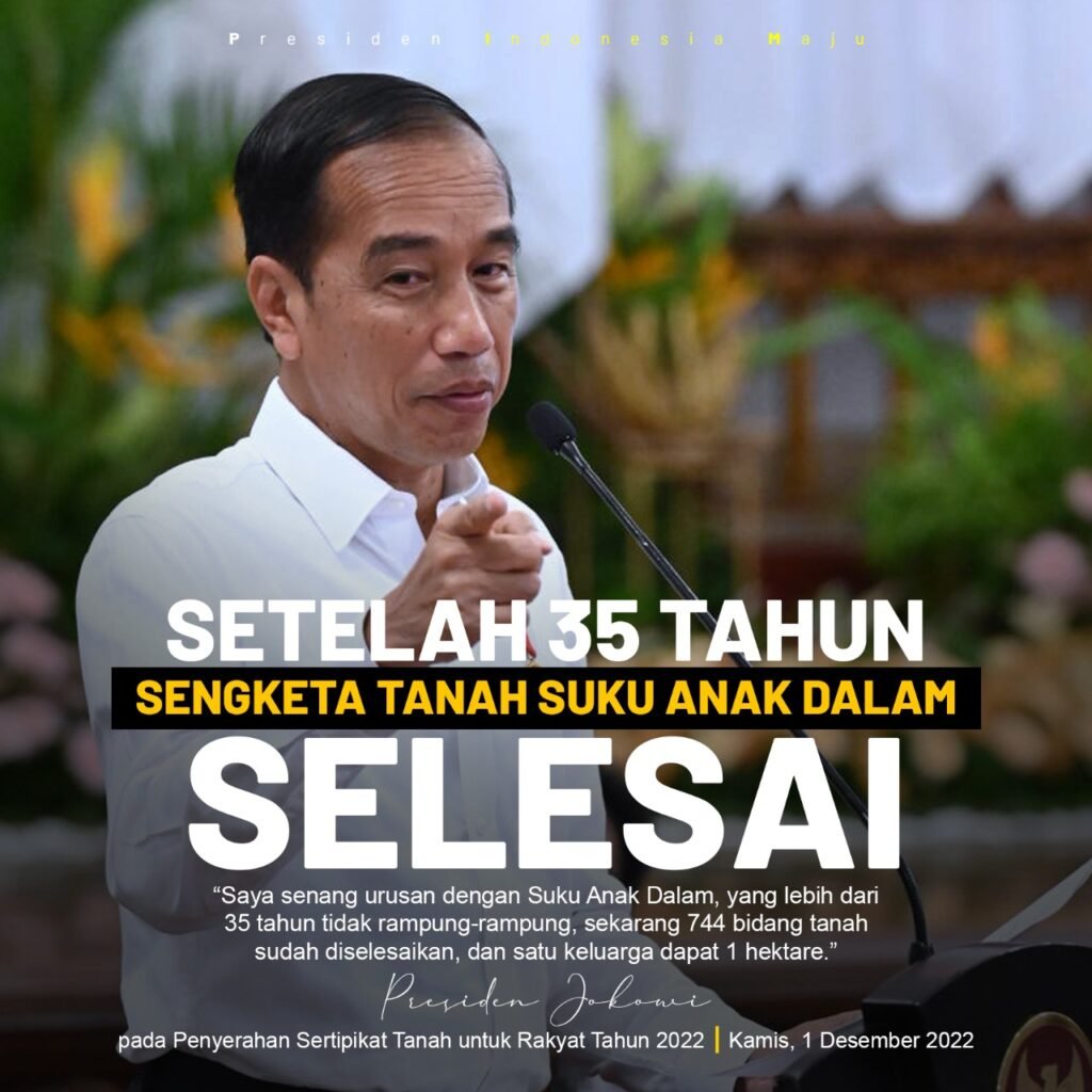 Dari sekian banyak sengketa, salah satu yang menjadi perhatian Jokowi adalah konflik agraria yanv melibatkan Suku Anak Dalam di Jambi. Ia bersyukur, kasus yang meletup selama lebih dari 35 tersebut akhirnya tuntas.